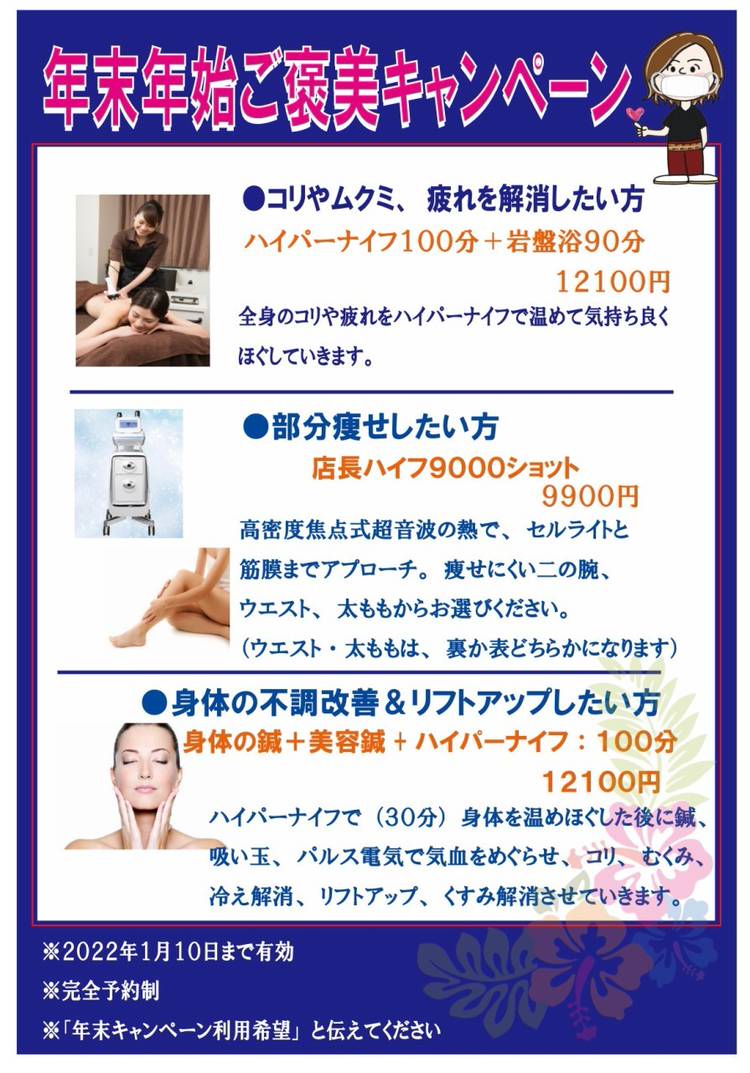 岩盤浴・よもぎ蒸し・岩盤ヨガ・オイルトリートメント…