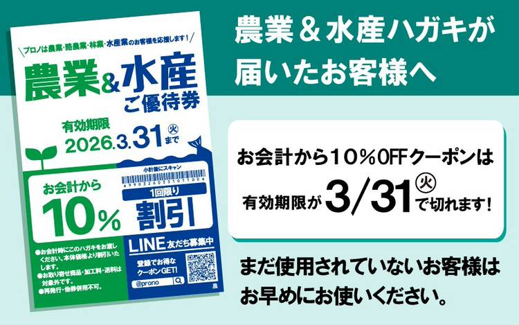仕事用品店「プロノ」のLINEへようこそ。 私たちプロノは「イイモノはきっと仕事を楽しくする」を合言葉に職人さんがよりカッコよく、 よりお仕事が捗るように機能性が高く、実用性が高い商品を圧倒的なお買い得価格で取り揃えています。 毎日繰り返されるワークライフの中で、少しでも快適に、仕事が楽しくなるような 変化をお客様にもたらすことがプロノのモットーです。 そのために「売れるモノ」よりも「お客様が納得できるモノ」を追求し、 プロノをご利用される職人さんやワーカーがこだわりを持って使える価値ある商品をご提供いたします。 プロノLINEでは、プロの職人さんが使う商品で、一般の方にも使っていただける便利な商品をプロノ情報誌「てまひま」や、 高価値商品やお買い得な価格設定で職人さんに大人気の「職人さん専用チラシ」、 プロノでしか買えない涼しいインナーウェアや凍った路面でも滑らない防寒靴など 「猛暑・防寒用お仕事用品特集チラシ」など今まで新聞や新聞折込広告でしか見る事が出来なかったお客様 に対して今後はリアルタイムでお客様のスマホへ配信が可能となります。 また、季節によって変わるテレビCMも公開。ちょっとシュールでカジュアルなプロノ独特な世界観を実感してください。