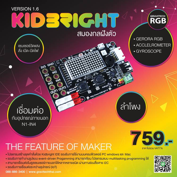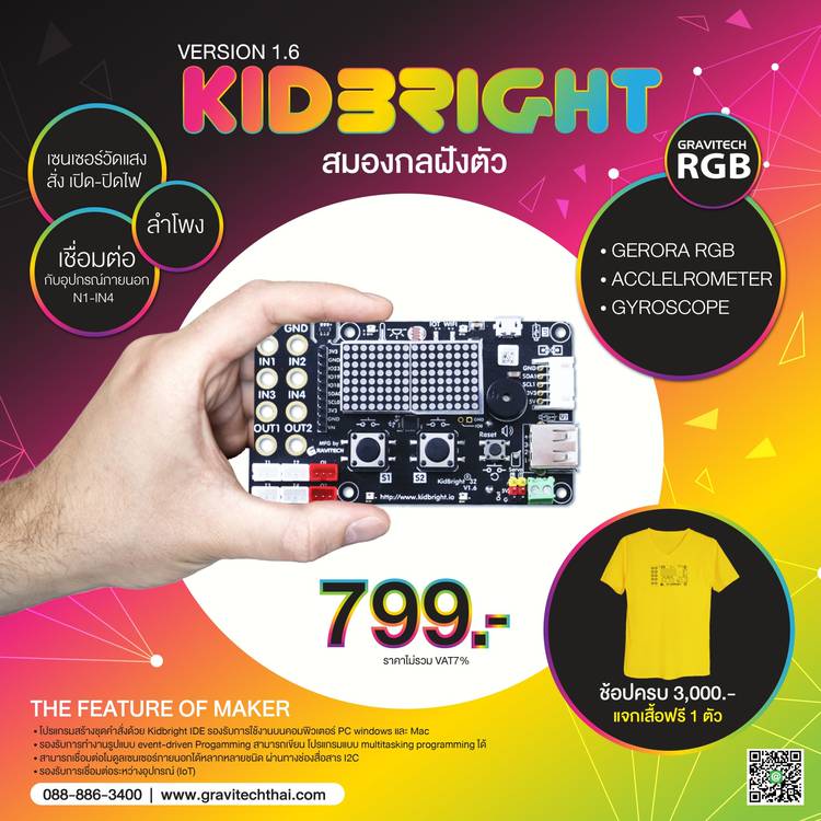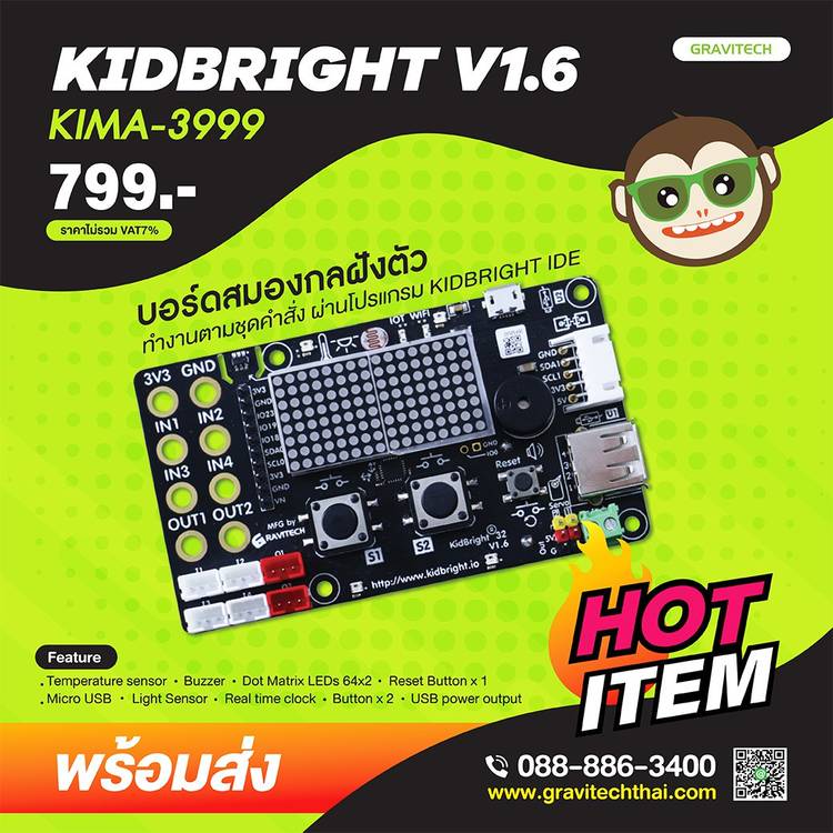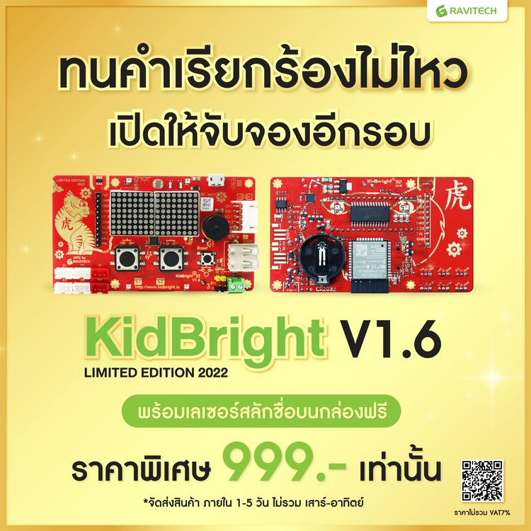 💚Kidbright V 1.6 Lot ใหม่มาแล้ว💚 บอร์ดสมองกลฝังตัว หรือ คอมพิวเตอร์ขนาดจิ๋วที่ภายในสามารถรับส่งข้อมูล ประมวลผล และสั่งการเครื่องมืออิเล็กทรอนิกส์ภายในบอร์ดได้ ซึ่ง Version 1.6 นี้มาพร้อมกับ 3-axis A...