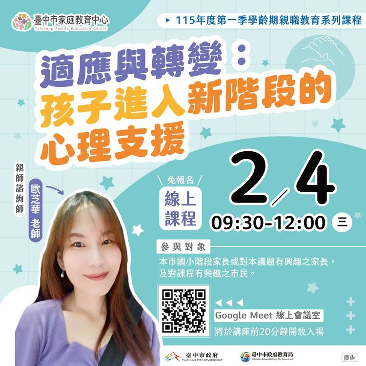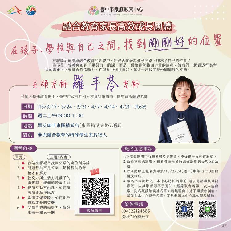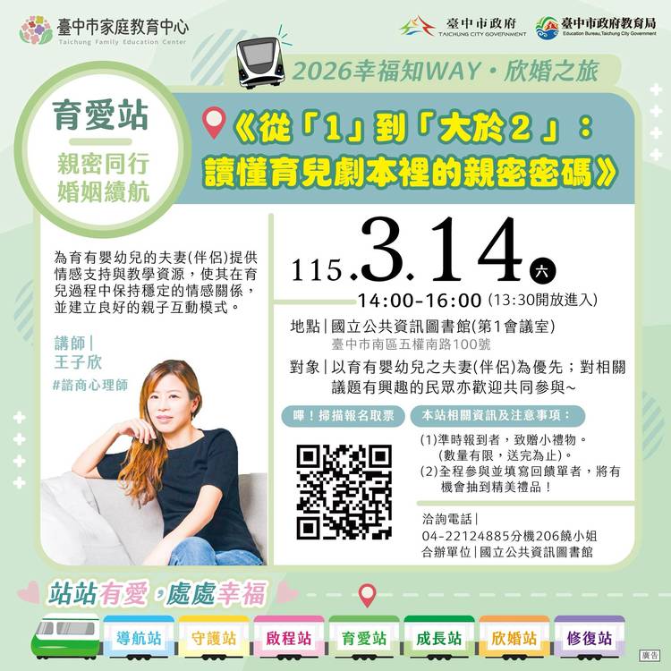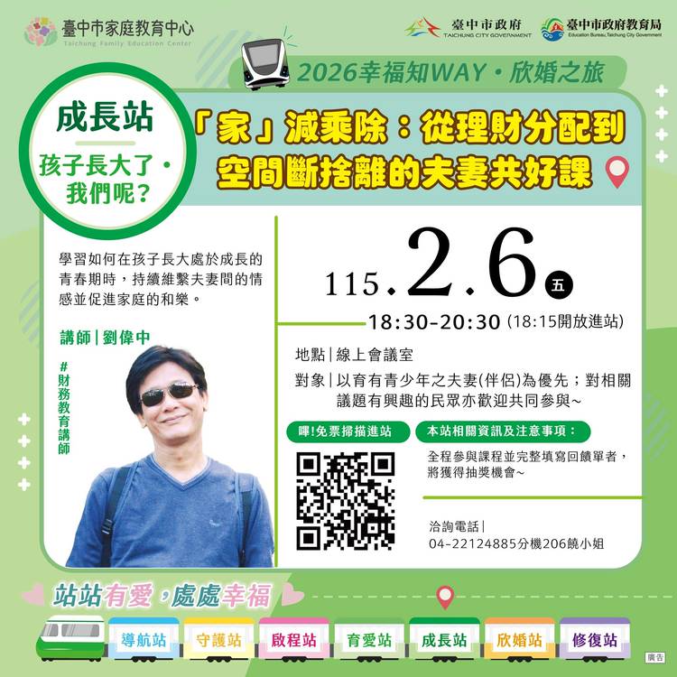 114年12月份活動一覽表 立冬上架! 🍁臺中市家庭教育中心邀您一起參與本月精彩多元的課程活動~從親職教育、婚姻經營、數位教養、青少年溝通、幼兒教養到性別教育及婚前交往準備等主題應有盡有,讓我們在溫馨互動的氛圍中學習,累積創造幸福、和諧家庭的力量! 更多詳細內容洽本中心活動海報、FB及LINE公告資訊 歡迎加入FB官方粉絲專頁、按讚、分享及追蹤更豐富的活動資訊 #好家在臺中 #挺你幸福進行中...