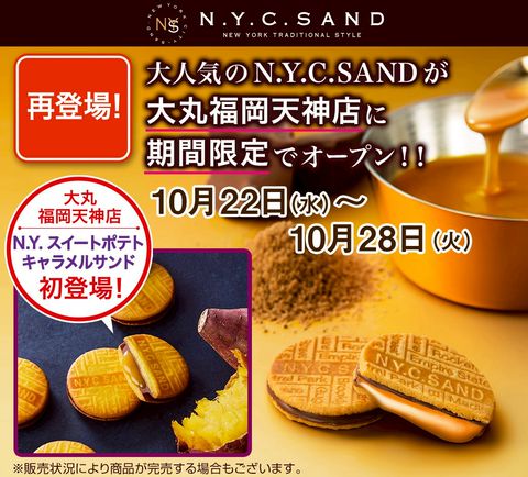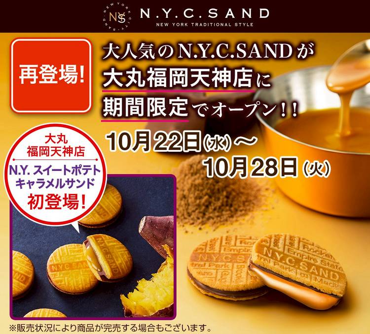看板商品のN.Y.キャラメルサンド。 お口の中でクッキー、チョコレート、キャラメルそれぞれが一度ほどけ、再び絶妙なハーモニーを醸し出します。