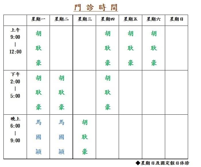 詠欣精神科診所為您提供最專業的身心醫學服務 舒適、輕鬆的就醫環境 院長: 胡耿豪 醫師 台灣精神醫學會精神專科醫師 美國AAH國際證照催眠治療師 台灣成癮科學學會會員 台灣臨床失智症學會會員 經歷: 臺北榮民總醫院玉里分院精神部主治醫師 臺北榮民總醫院玉里分院精神部總醫師 臺北榮民總醫院精神部住院醫師訓練 高雄醫學大學醫學系學士 主治項目: 失眠、憂鬱、焦慮、恐慌、催眠及心理治療 自律神經失調、腦神經衰弱 記憶減退、壓力適應障礙、強迫症、躁鬱症、幻覺及精神病、藥酒癮戒治、暴食厭食、老人身心疾病、注意力不集中及過動、青少年心理諮詢、親子關係、婚姻諮詢