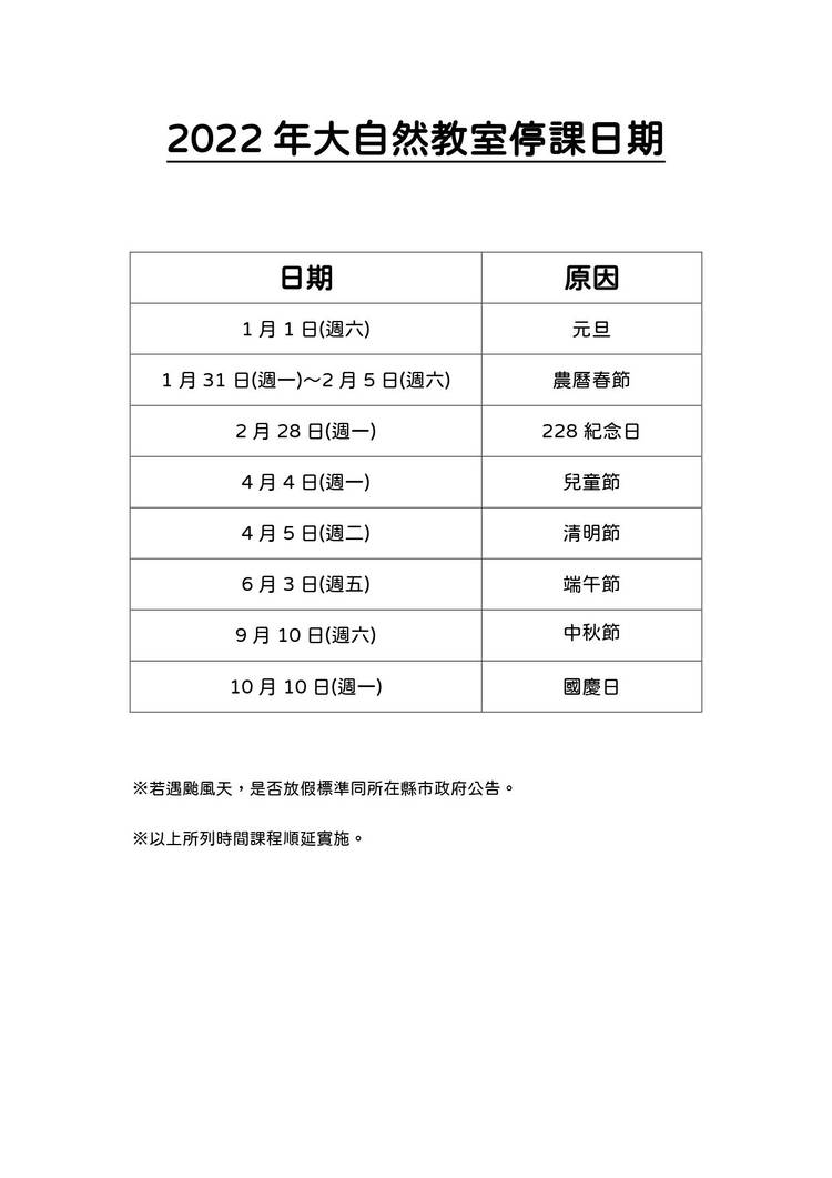 2022年 、2023年大自然教室停課日期