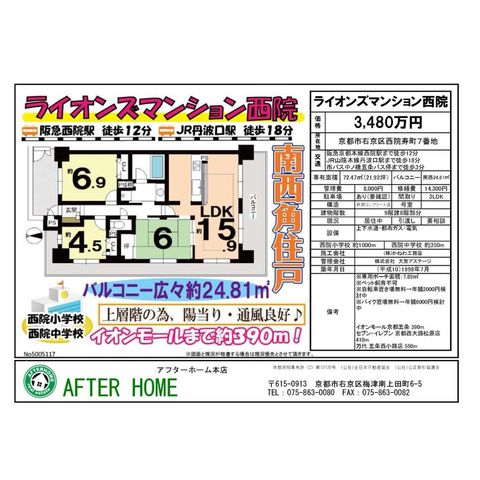 右京区梅津段町の交差点から西に約70mの場所にある不動産屋とは思えないぐらいのおしゃれな外壁が目印です♪ モチーフはカフェのようなお客様がお気軽に、また居心地良く長居して頂けるようにと思いを込めて、一流デザイナーにデザインして頂きました。