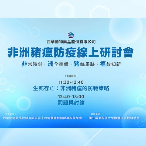 全世界前五大動物保健公司-西華動物藥品,於2019年4月正式在台灣設立分公司,我們將以嶄新的團隊,為您的牧場提供最完整的保護和服務。西華動物藥品是業界家禽和家畜疫苗、化學藥品及保健產品的佼佼者,除了原有的傳統型疫苗外,在免疫複合體疫苗及載體疫苗等新技術疫苗的研發更是與時俱進。而今台灣分公司的設立,將為台灣畜牧業市場提供更專業的技術服務、更多的國外最新資訊及更先進產品。