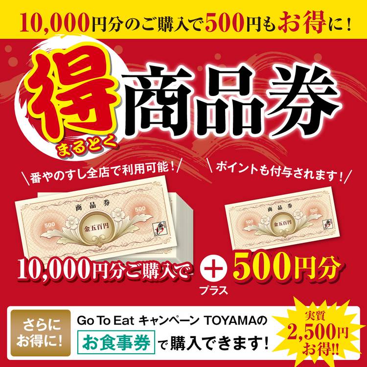 お得な【商品券】 \好評発売中!/ ご存知ですか?番やのすしの商品券 ご自身でのご利用はもちろん、ギフトにも最適です ☆★さらにお得に!★☆ Go To Eat キャンペーンTOYAMAの「お食事券」でもご購入いただけます! お得にお寿司をお楽しみください ※ご購入は前日までにお電話・店頭にてご予約ください。 ※ご購入当日はご利用いただけません。