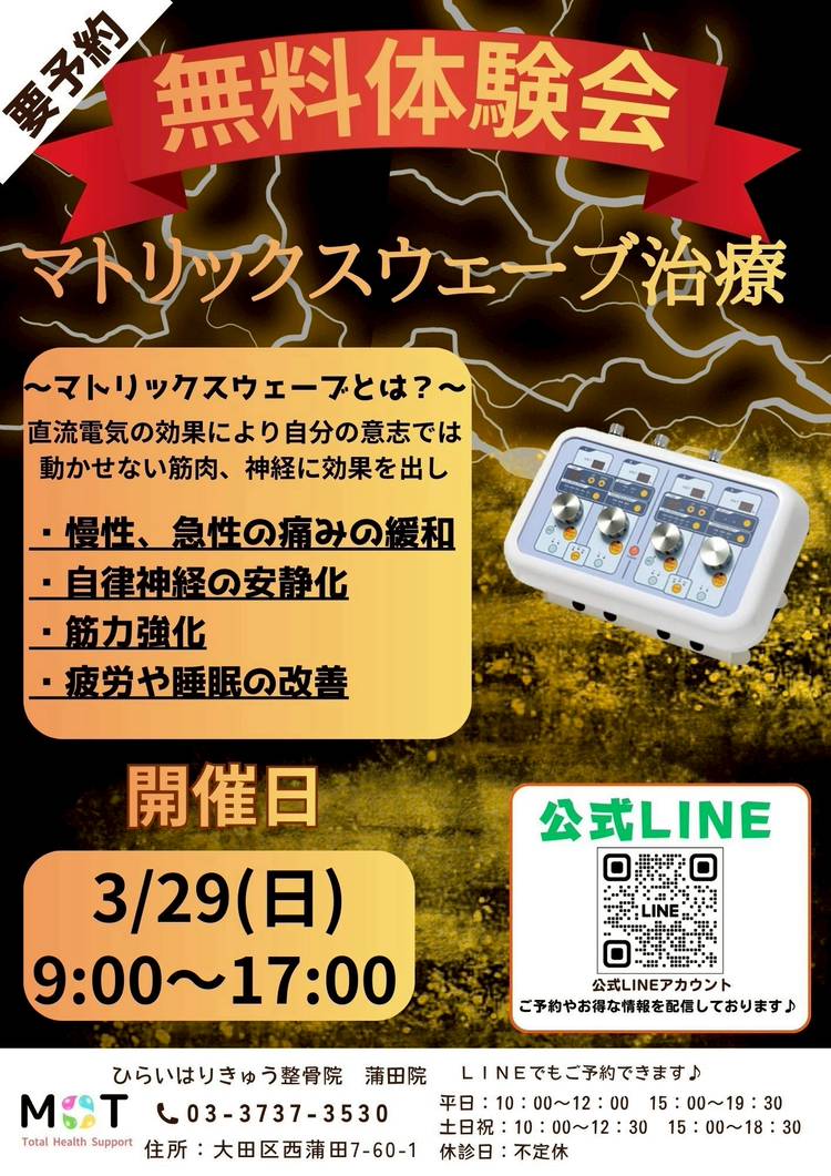 平成18年2月に大田区西蒲田にオープンしました。 痛みでお悩み方~痛みのでない予防で通われている方が多くいらっしゃいます。 他で治らなかった痛み、不調は一度ご相談ください! =============== ひらいはりきゅう整骨院のご紹介 =============== ◎予約不要 当院では地域の一人でも多くの方によくなってもらいたいと考えおります。 「急な痛みでも予約いっぱいで行けない…どうしよう…」 という方の駆け込み寺になれればと思っております。 ◎豊富な治療メニュー 人それぞれに様々な骨格や筋肉の質、そして体の刺激への反応の出方があります。 その一人ひとりの症状や体に合わせたメニューの提供をおこなっています。 もちろん人によって苦手なものもございますので、安心してお伝えください。 ◎予防の方の施術OK 保険を使用することはできませんが、体を評価させていただき身体のバランスを整えたり、日頃の疲労をとることが可能です。 ◎スタッフ全員がトレーナー経験者 スタッフ全員が学生や社会人のスポーツトレーナーの経験がございます。 運動中のケガや疲労、またお子さんのケガなどお任せください。 ◎子連れもOK 院内でお子様を遊ばせておくこともできます。 院長佐藤はこう見えても2児のパパです笑 お子様を遊ばせるだけでなく母親ならではの悩みもご相談ください。 ======== 当院が得意な症状 ======== ◎急な痛み(寝違えやぎっくり腰、けが) ◎頭痛もちでひどり肩こり ◎長年持っている膝の痛み ◎交通事故によるむち打ち・シビレ ◎その他、すべての不調に対応しております。 当院を受診しようか迷われている方、悩まれている方はお気軽にLINEまたはお電話にてご相談をお受けします。