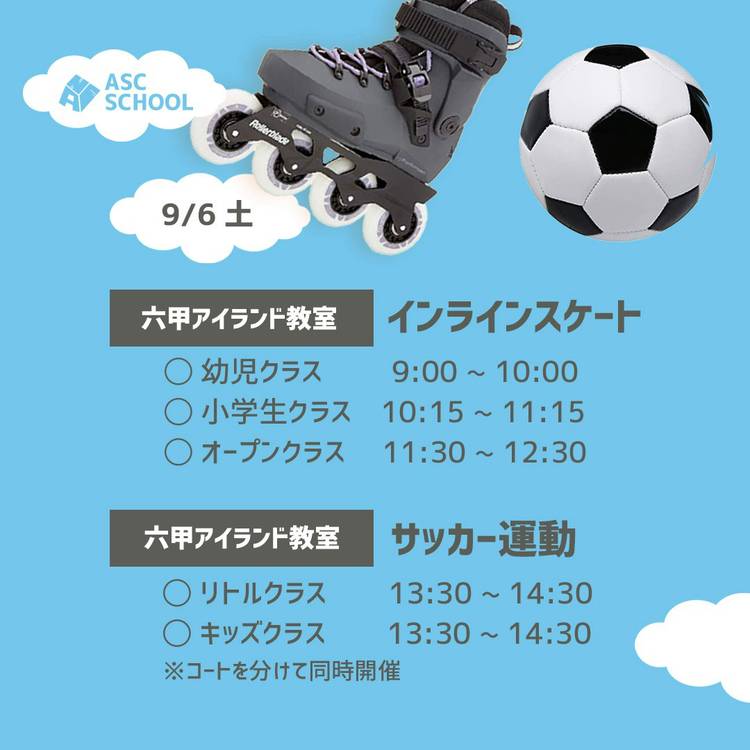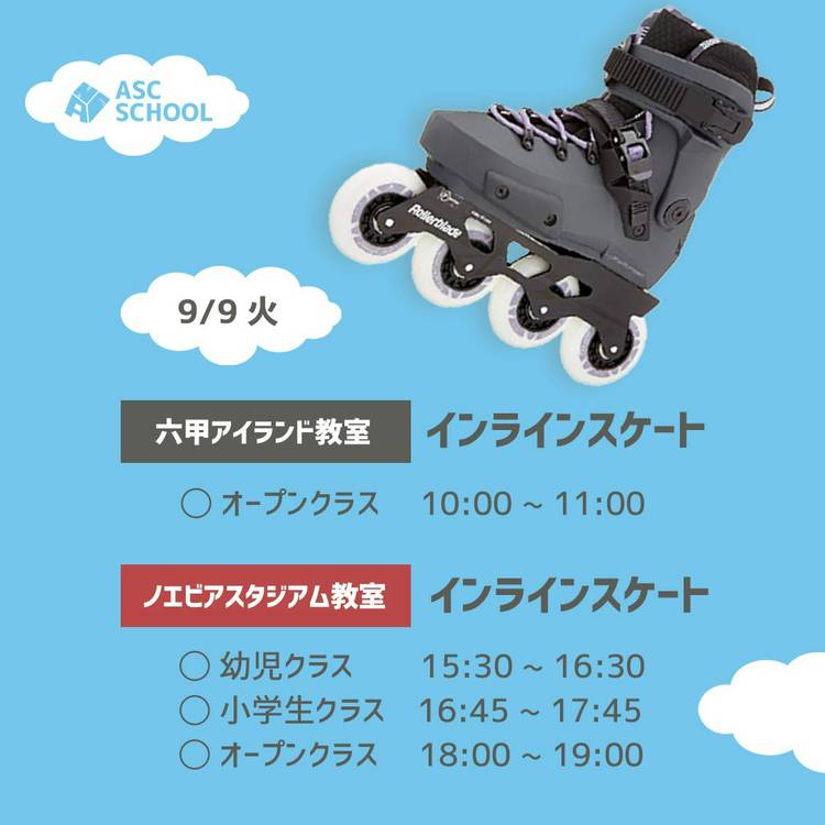 各クラスご予約はこちらから。 皆さまのご参加お待ちしています! ◯六甲アイランド教室 ・インラインスケート 幼児クラス https://coubic.com/ascschool/642075 ・インラインスケート 小学生クラス https://coubic.com/ascschool/678036 ・アスリート初級クラス https://coubic.com/ascschool/460245