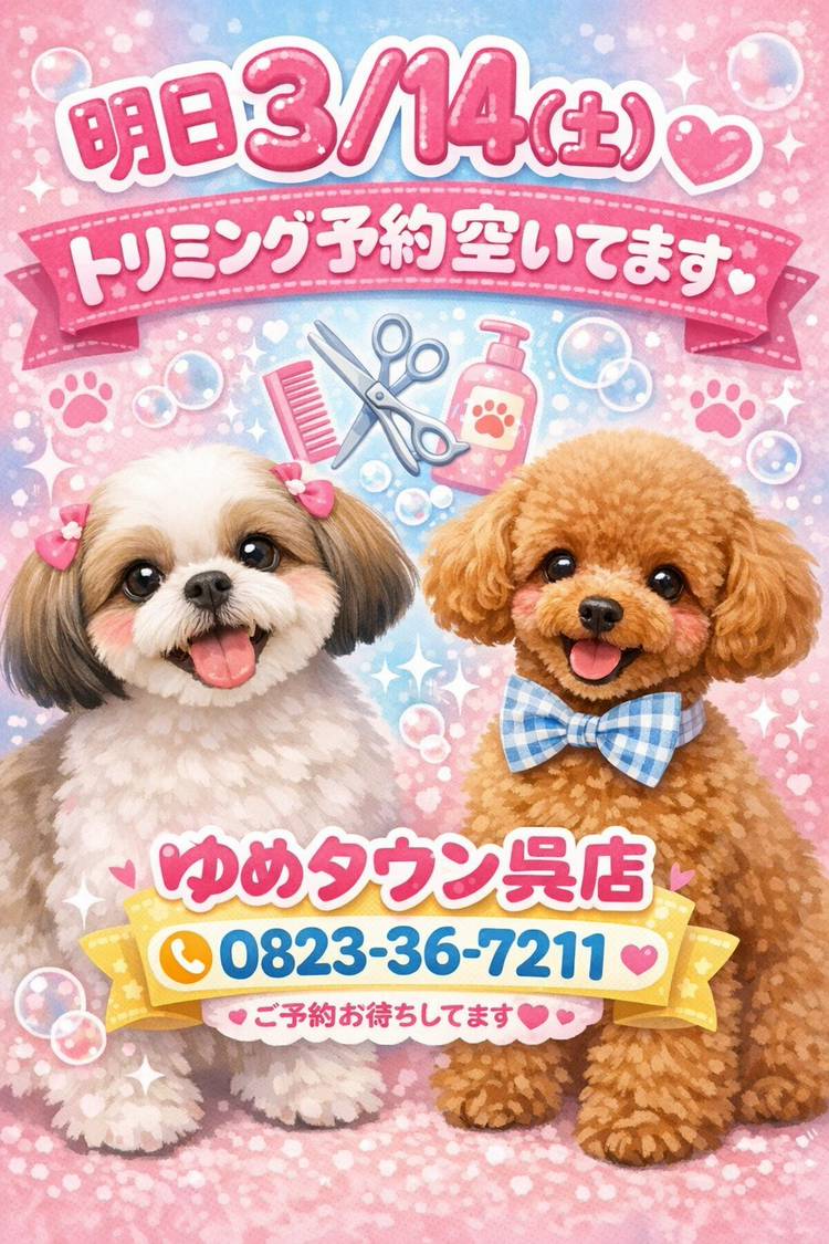 広島でブリーダーも手がけるペットショップ、おもに、プードル・ヨーキー・チワワ・スコティッシュ・アメショーを扱います。 呉保生指令 第06-6004号 販売業 第06-6005号 保管業 JKC A級トリマー マウスケアメンター アニコム損害保険取り扱い代理店 ●広店 住所/呉市広文化町4-43-101 TEL/0823-72-6775 営業時間/9:00〜19:00 ●マリーナホップ店 住所/広島観音新町 マリーナホップ内 TEL/082-503-1822 営業時間10:00〜19:00 ●ゆめタウン呉店 住所/呉市宝町5-10 ゆめタウン呉店内 TEL/0120-009-711 0823-36-7211 営業時間10:00〜22:00 ●マリージョジョ 住所/広島県呉市阿賀中央6丁目1-34 藤三ショッピングセンター内 TEL/0120-670-083 0823-72-6700 営業時間10:00〜19:00