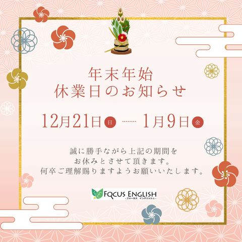 あかちゃんから大人までの おうち英会話 Focus English 日本語を自然と覚えてきたように、くつろげるおうちの環境で自然と英語で『伝える』『伝わる』を楽しみましょう! <固定制レッスン> 「聞く」「話す」の会話メインのレッスンです。 沢山聞いて、沢山話せる、少人数制です よく使うフレーズをシチュエーション(場面)ごとに学ぶので、効率よく生きた英語で楽しくコミュニケーションができます ・大人英会話(中学生〜シニア) ・子供英会話(幼稚園年中〜小学生) ・子育て親子英会話(0歳〜4歳) <予約制> (単発可能) ・大人英会話(プライベート) 1〜4名 ・半日・1日国内ホームステイ ・ホームステイレッスン 国内にいながら、気軽にホームステイが体験できます その他 ・講師派遣 ・日本人講師による親の英会話レッスン(予約制) Focus English は 「英検Jr.」登録校です