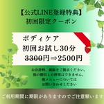 お悩みによって、手技を組み合わせたコース ほぐし ボディケア ストレッチ アイ、ヘッド 足つぼ(オイルかクリーム) ハンド(オイルかクリーム) など お悩み別コースをお一人お一人に合わせて選べるボディセラピー LINEお友達でメンテナンスのお客様は特割あり (税込価格) 20分¥2,200 40分¥4,400 60分¥6000→5,500 90分¥9000→¥8,500 10分ごとに施術時間を決めれます。