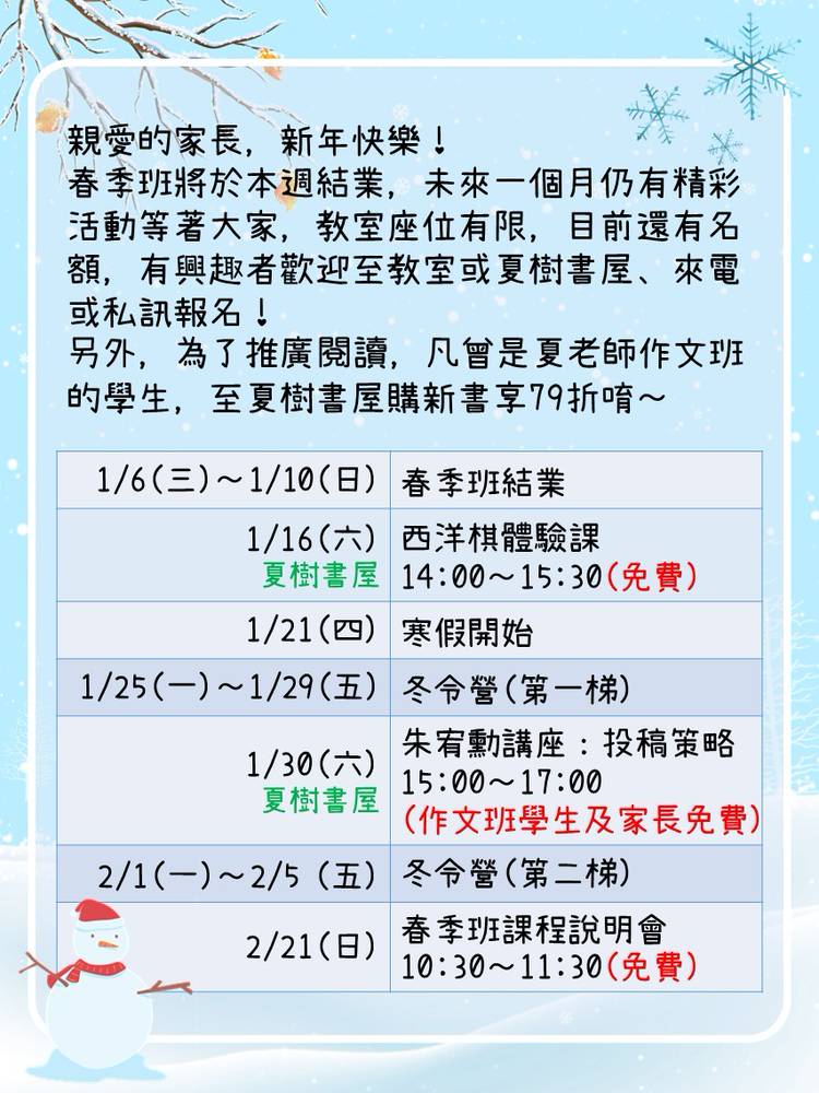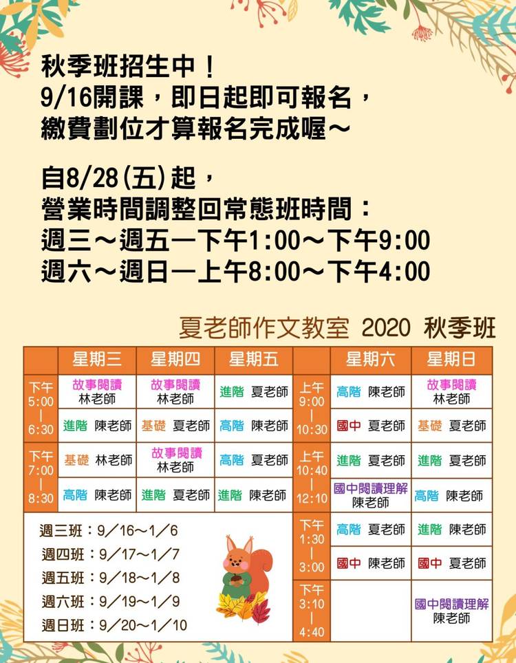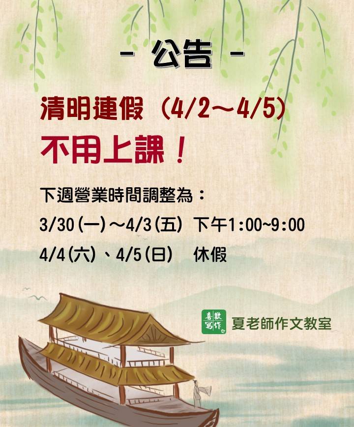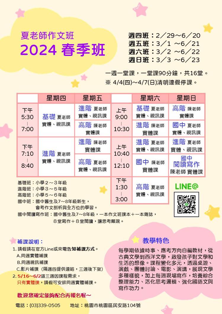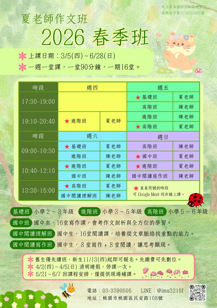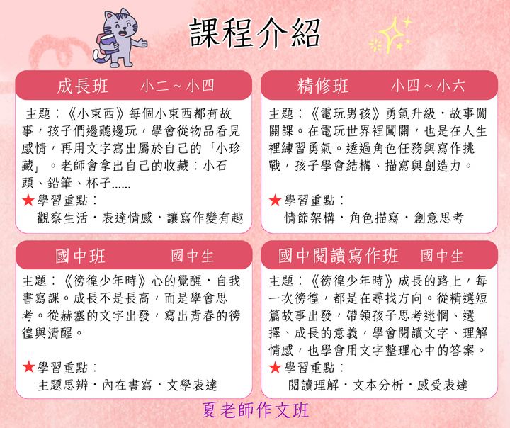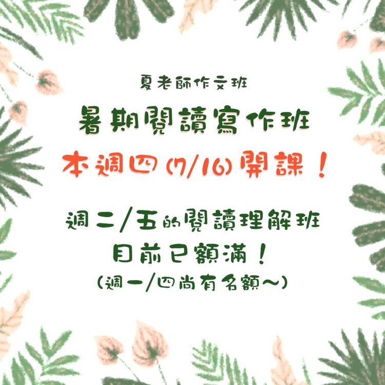 ☀️2024 暑期閱讀寫作班✒️ ~讓孩子愛上閱讀,提升寫作能力~ ~互動討論,趣味引領~ 🌟上課日期: 週一/四班:7/4~8/22 週二/五班:7/5~8/23 一週2堂課,一堂90分鐘,共15堂。 . 🌟舊生優先續班,新生5/15起即可報名。先繳費可先劃位。 . 🌟年級 (暑假過後): 基礎班:國小3~4年級(新生) 進階班:國小4(舊生)~5年級(新生) 高階班:國小5(舊生)~6...