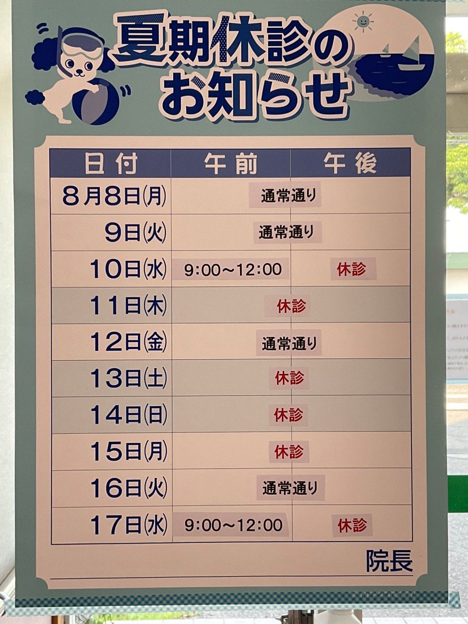 日曜、祝日は休診ですが、留守番電話での対応は可能です。