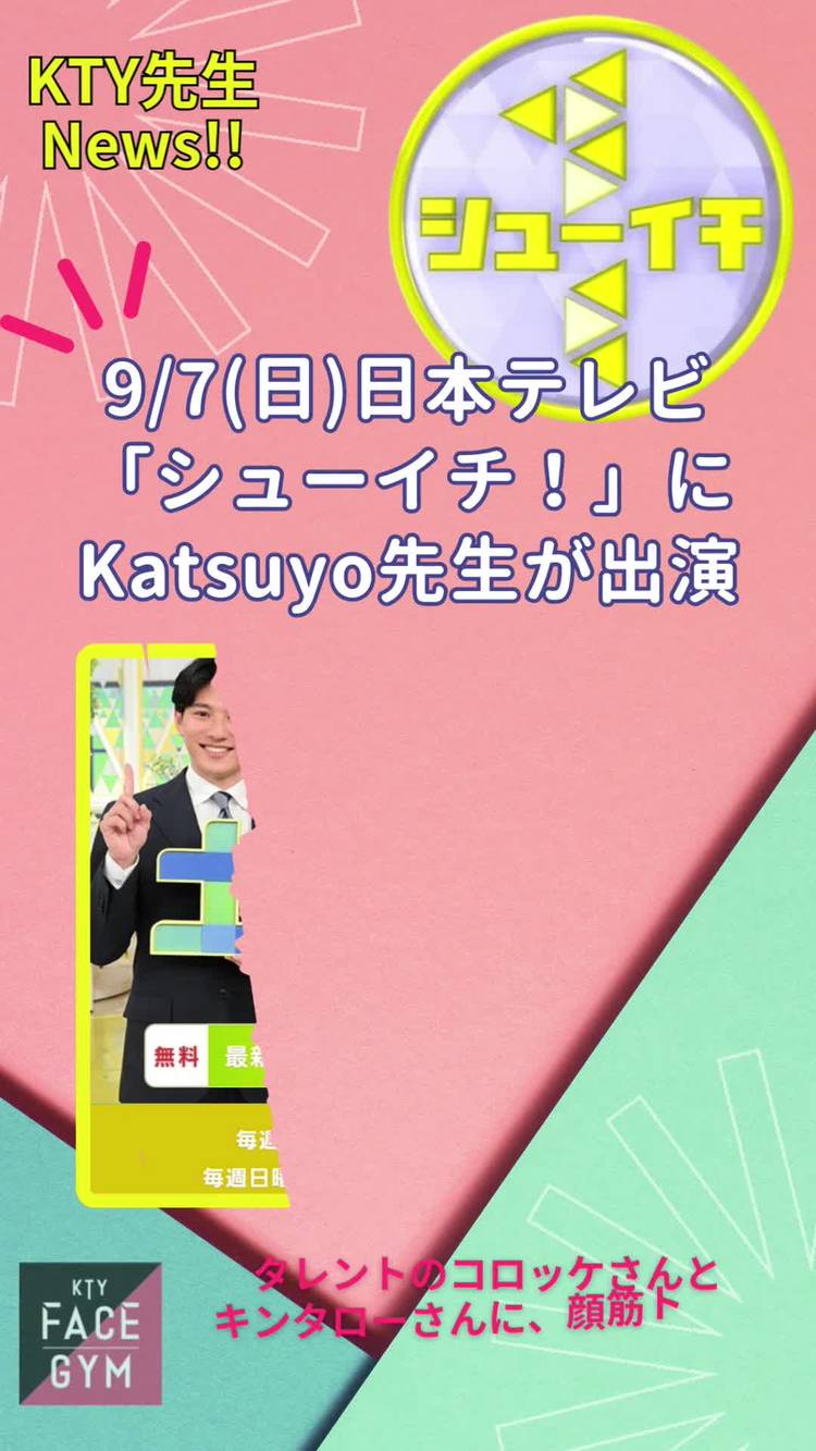 *:・゚✧*:・゚✧ *:・゚✧*:・゚✧ *:・゚✧*:・゚✧ 中山秀征さんMCの朝の情報番組 9/7(日)「シューイチ!」出演情報 企画放映時間:午前8:40以降~ *:・゚✧*:・゚✧ *:・゚✧*:・゚✧ *:・゚✧*:・゚✧ いつもKTY FACEGYMをご愛顧頂き、ありがとうございます^^ なんと・・!!!! この度、KTYフェイスジム考案者のKatsuyo先生...