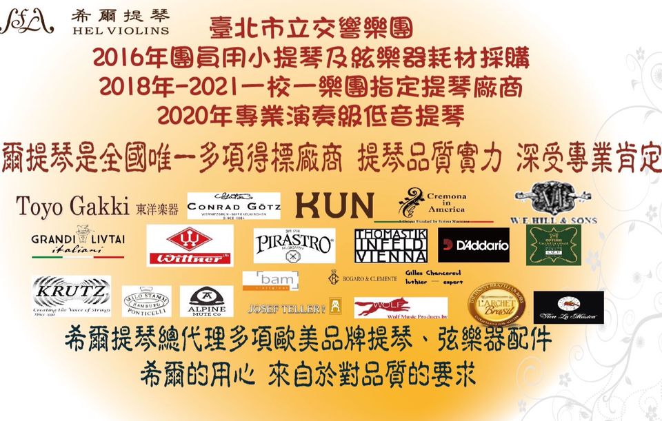 希爾樂器有限公司(以下簡稱希爾樂器)創立於2013年,是一個兼具研發、設計、進口提琴樂器、配件的專業團隊。也是台灣第一個以弦樂教育經驗為基礎,並且從不同演奏者角度出發,開發優質專業提琴的公司。 希爾樂器是由一對音樂研究系所畢業主修弦樂的年輕夫婦所共同創立。自從希爾開業的第一天起,就非常努力地加速實現他們對美好琴聲的夢想。因為年輕,希爾樂器在經營上便需整合許多年輕人的力量,一起實現讓孩子用對琴、聽見美好音樂的理念。希爾樂器在台北市已經有許多志同道合的年輕夥伴,共同為希爾的客戶做最專業的服務。 About Hel Violins Hel Violins is one of the major professional string instrument and strings accessories wholesalers in Taiwan. We produce and import string instruments and accessories from student level to masterpieces, providing services for musicians, professional symphony orchestras such as TSO (Taipei Symphany Orchestra), educational organizations, music teachers and students. Hel Violins is established out of a strong faith that everyone deserves to have a high quality instrument no matter you are a musician, student, or a beginner. Hel Violins values every player’s feedbacks which are very influential to our future direction.