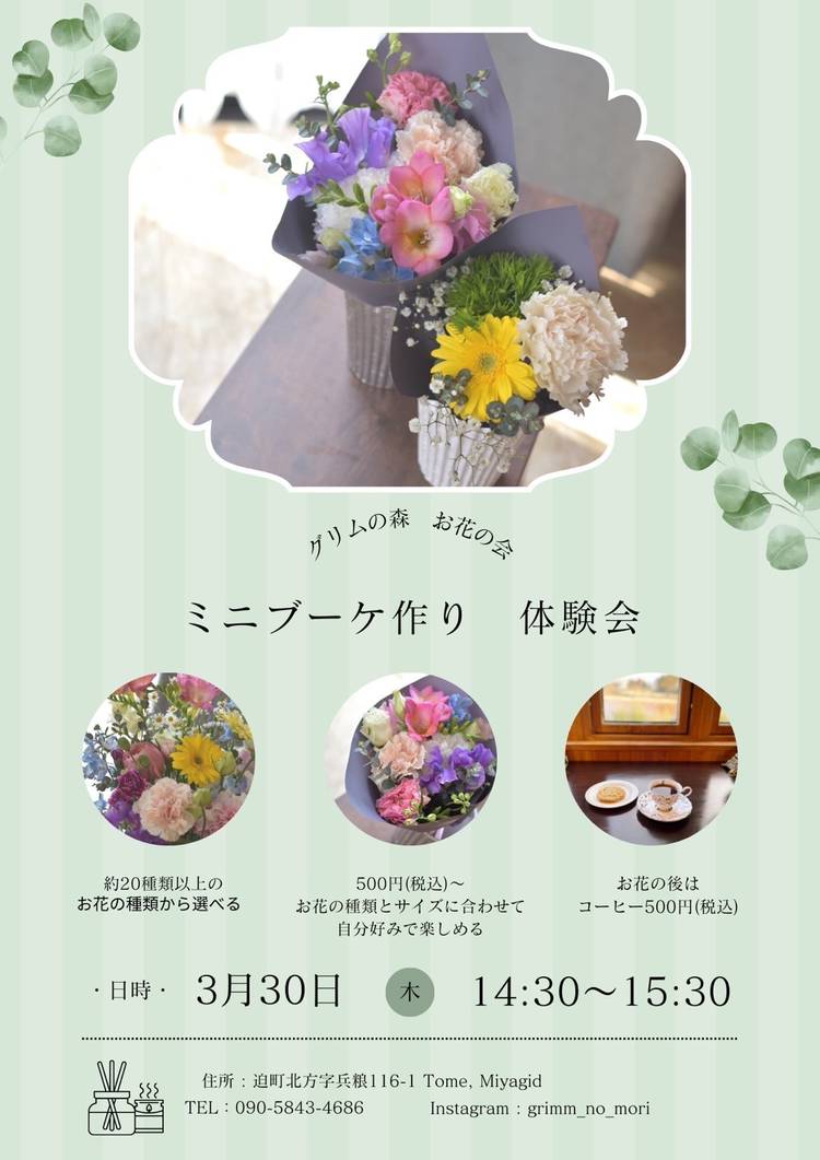 宮城県登米市中田町のウジエスーパー佐沼本店内に出店させて頂いています。 普段遣いのカジュアルフラワーを中心に、花束、アレンジメント、ブリザーブドフラワー、スタンド、慶弔スタンド、祝い花、胡蝶蘭等、ご要望にありましたら、何でもご相談ください。 登米市内は配達でのお届けも対応していました。