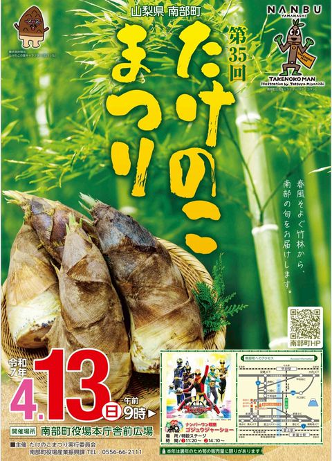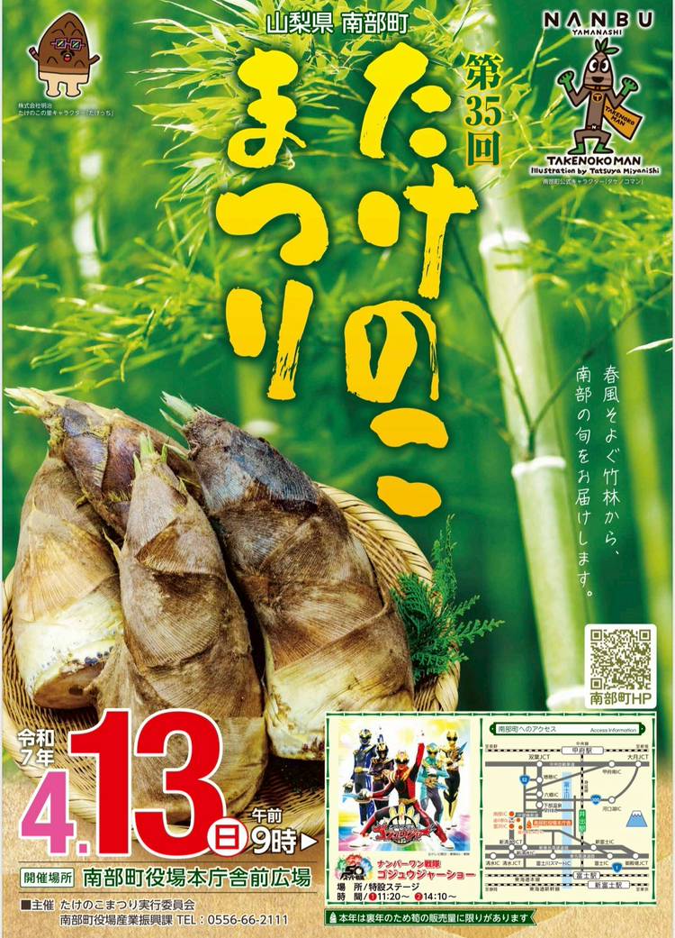 山梨県南部町にある道の駅とみざわ。 山梨県で第一号に登録された道の駅で、特産品のタケノコがモニュメントとなっています。 春にはタケノコ、夏にはスイカ、秋はしょうが、冬は菊芋やチョロギと、いつでも旬な野菜や特産品でお待ちしております。