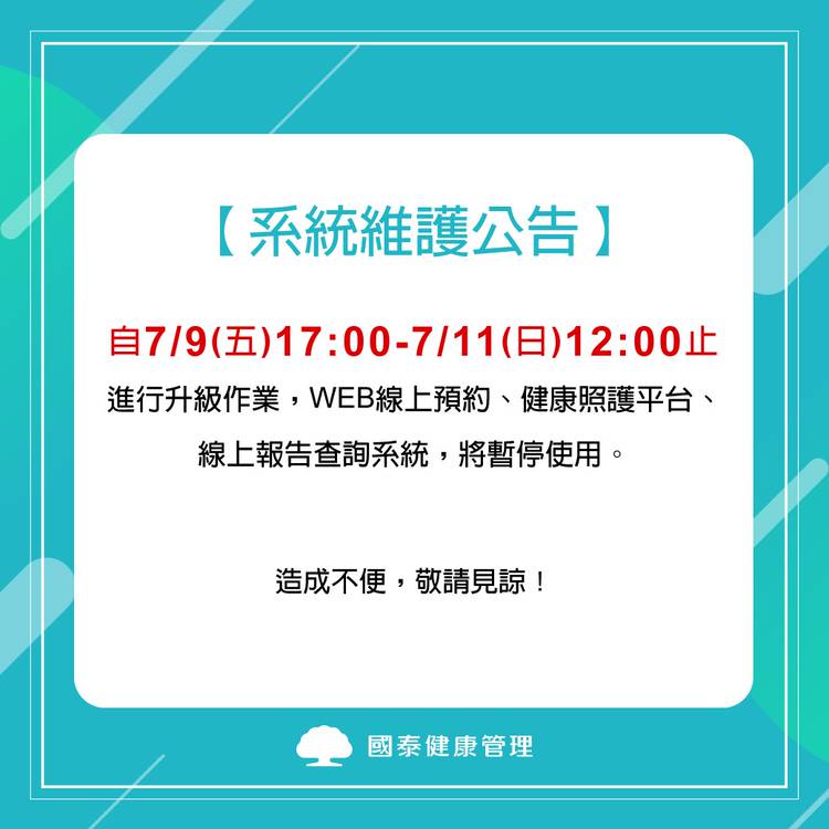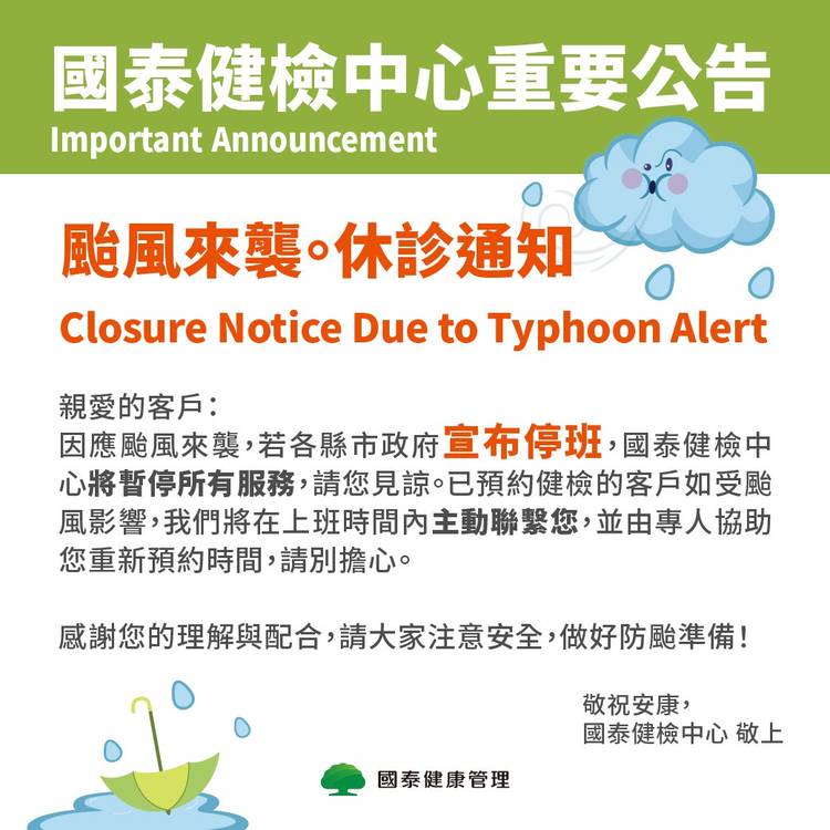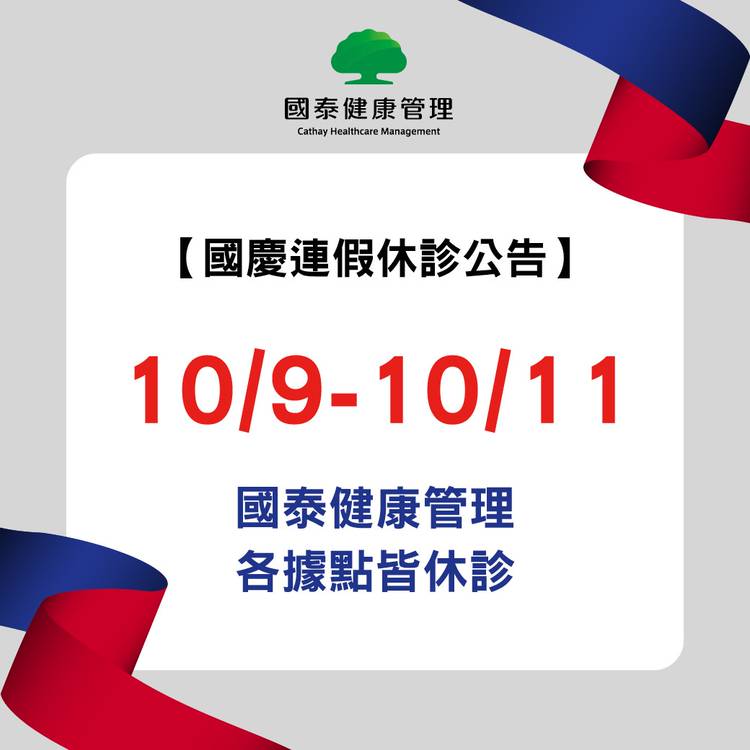 【休診公告】 4/2-4/5國泰健康管理各據點皆休診 若需預約請使用官網線上預約功能 諮詢歡迎使用官網線上表單留言 專人將於上班日回覆,不便之處敬請見諒。 線上預約https://bit.ly/3il09Mm 線上表單留言https://goo.gl/otd6fG
