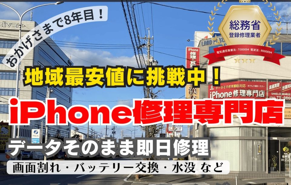 【総務省登録修理業者】岡崎市及び近隣エリアでiPhone(アイフォン)の修理・買取り、スマホガラスコーティングをお考えなら岡崎市大樹寺近くのSHIELD(シールド)岡崎店にお任せください!