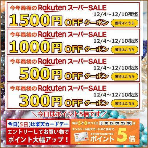 こんにちは。店長松井です。 楽天イーグルス感謝祭が3日間限定で開催中♪ 今日15日は楽天カードデーも重なって、 ■イーグルス感謝祭でポイント5倍 ■楽天カードデーでポイント5倍 感謝祭期間限定5種類のクーポンも当店は参加中です。 クーポンは店舗内で獲得案内をしております。 セール会場も更新していっております。 冬のアクセサリー制作のお役立ちになりましたら幸いです☆ 天然石アロマ工房楽天店 ...