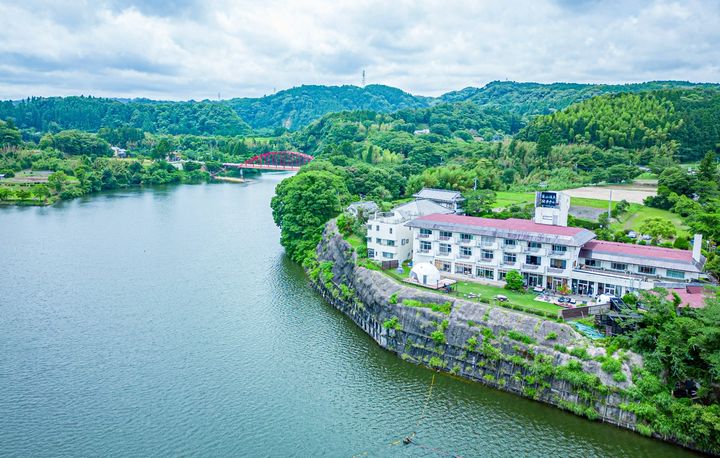 千葉県房総半島のほぼ中央に位置する県下一の湖亀山湖。この湖を一望する高台にある14室の小さな温泉旅館が亀山温泉ホテルです。