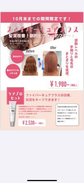 ■メニュー *カット(大人) ¥2,700 *カット(中・高校生) ¥2,376 *カット(小学生以下) ¥1,728 *カット+カラー ¥6,372~ *カット+パーマ ¥7,452~ *カット+カラー+パーマ ¥10,584~