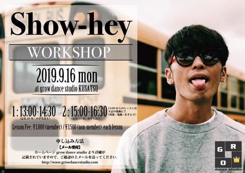 SpecialなWS急遽開催決定!!!! RADIO FISHのメンバーであるShow-heyがなんとgrow dance studioに!! こんな機会はなかなかないので是非っ!! 今回は草津校で開催の為、定員に限りがございます。 定員に達した時点で受付は締め切らせて頂きますのでお早目にお申込みください。 2019/9/16(MON) ①13:00~14:30 *小学生以上 ②15...