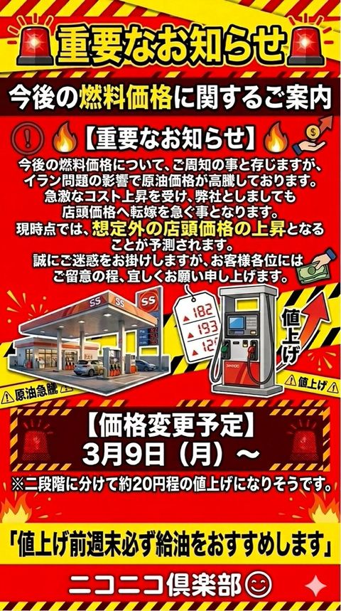 ニコニコ倶楽部飯塚店です。ガソリンスタンドと整備工場併設した工場です。☆キズヘコミ修理☆車検整備☆中古車・新車販売☆は地域最安値にて!!さらにガソリン価格も!VIP会員はなんと!最大10円引きで給油が出来るガソリンスタンドです!是非ヨロシクお願いいたします