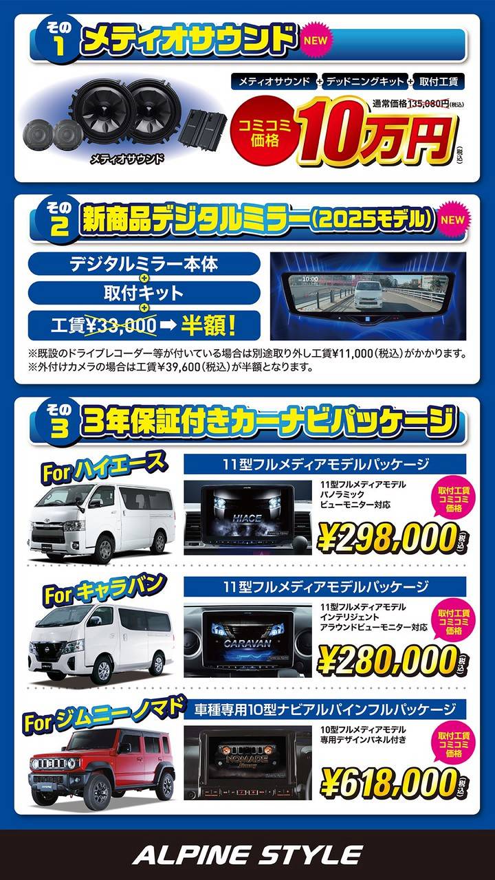 アルパインスタイル横浜246は、2019年2月9日(土)にオープンしました。 アルパインがプロデュースするカスタマイズカーーをはじめ最新のアルパイン製品を体験する事が可能です。 カスタマイズのみならず、サウンド改善やモニター増設のご依頼など、お気軽にご相談ください。