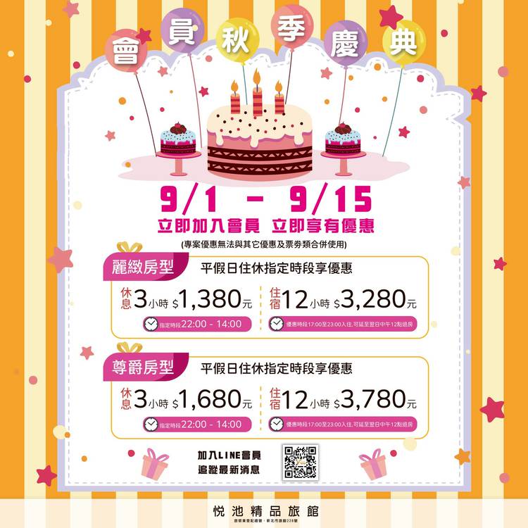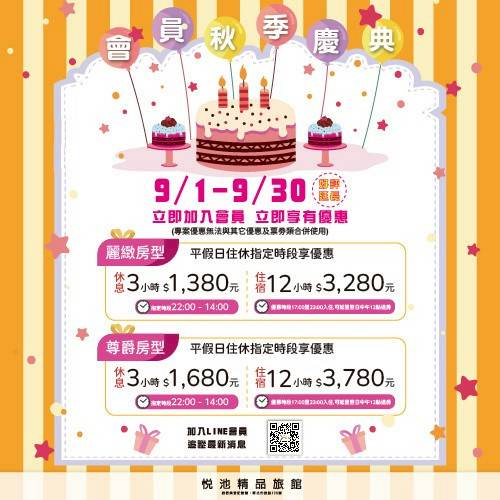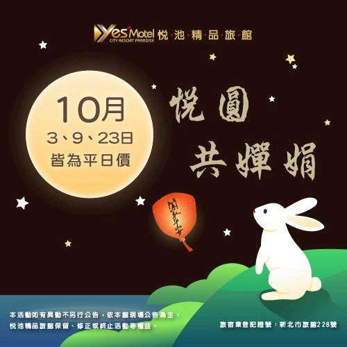 【🌕悅圓共嬋娟💖】 悅池精品旅館全體同仁 祝您中秋佳節愉快🥮 本館10/3、10/9、10/23日皆為平日價 快來加入會員關注最新消息🙌 📲官方LINE: https://lin.ee/U1fXtKv 🔎官網: https://reurl.cc/4NVLe3