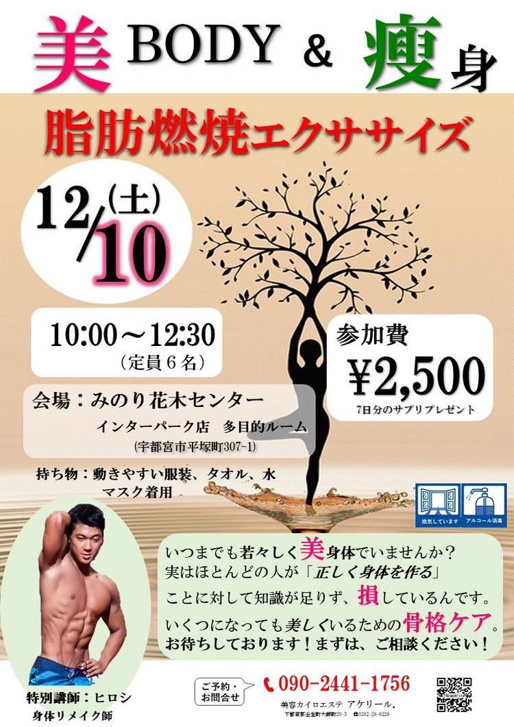 皆様こんにちは 早いもので10月となりました。 涼しくなってきて、夏の疲れを感じたり、気温の変化にカラダがついていかず、だるさや不調を感じている方が増えています。 なぜ季節の変化や気候の変化により不調が起きるのか? それは自律神経の働きによるものです。 カラダのことを知って、楽な日々が送れるようにしましょう! 10/8(日)に1日体験教室が開催されます。 カラダのこと、お肌のこと、セルフケア、...