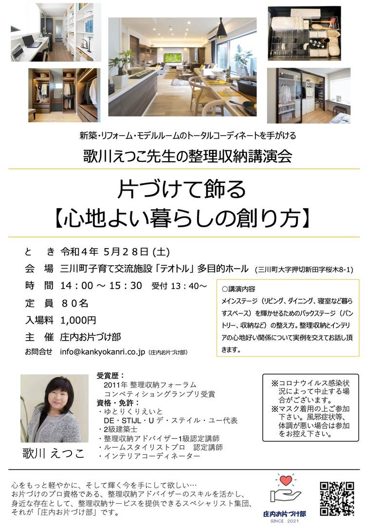 「片付けて飾る」【心地よい暮らしの創り方】講演会です こんにちは。雪国でも春が近づいてきたと感じる日が増えてきましたね。どんなに厳しい冬でも春は来るのですねそして暖かくなるとお片付けしたくなりませんか?今朝なぜかスイッチが入ったわたしは季節飾りの見直しをして衣装ケース一つ分のモノを手放しましたー 今日の本題はセミナーのご案内。 庄内の整理収納アドバイザーで作ったサークル「庄内お片づ...