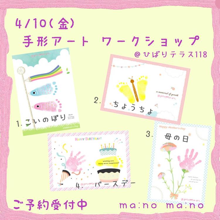 11月手形アートワークショップ受付中! 11月17日(水)は、秋のアートに、早めのクリスマスアートをご用意。 季節のアートは4種類! ①2021年新作の「秋の動物」アート ②「芸術の秋」アート ③「雪だるまのクリスマス」アート ④2021年新作の「トナカイのクリスマス」アート もちろん、 ⑤「バースデー」アート もご用意しています。 マスク、消毒など、コロナ対策はもちろん、 かなりの少...