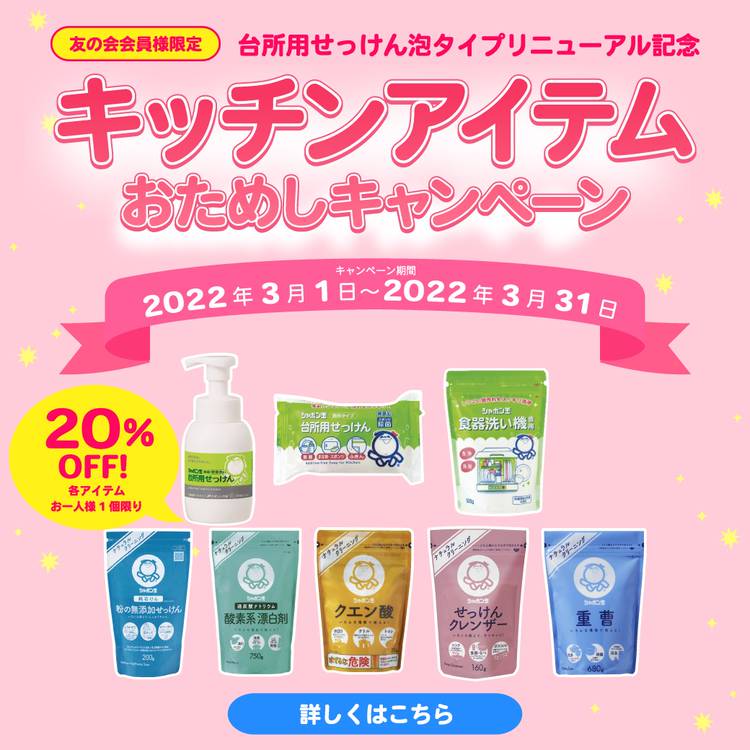 https://bit.ly/3OHfRB0 今月の友の会会員様限定キャンペーンは対象の固形石けんをご購入の方にプレミアム浴用石けん“ビューティーソープ”をプレゼント♪ 対象アイテムは全11アイテム!石けんが好きな方にこそ使っていただきたい、洗顔にも、全身洗いにもご使用いただけるお肌にやさしい無添加石けん。 ぜひこの機会に固形石けんをご購入いただき、お得にビューティーソープをゲットされてみて...