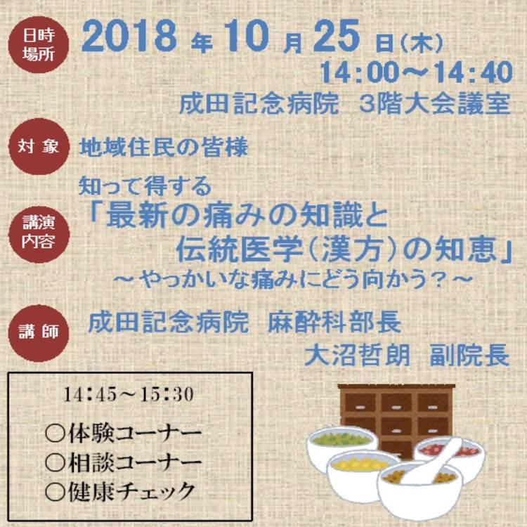 成田記念病院 市民講座を開催します。 ■参加費無料 ■事前申込不要 ■日時場所: 2018年11月19日(月) 13:30〜 成田記念病院 3階大会議室 ■対象:地域住民の皆様 ■講演内容: 「内視鏡 半端ないら!」 ■講師:成田記念病院 消化器内科 藤原 裕之 先生 ■紹介HP http://www.meiyokai.or.jp/narita/5636.htm...
