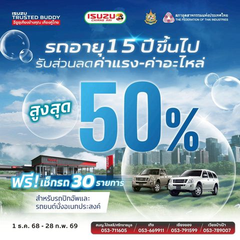 ผู้จัดจำหน่ายรถยนต์อีซูซุเจ้าแรกของจังหวัดเชียงราย เปิดให้บริการยาวนานกว่า 40 ปี ปัจจุบัน มีโชว์รูมและศูนย์บริการทั้งหมด 5 แห่ง ดังนี้