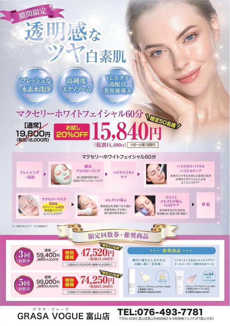 こんばんは🌙 グラサヴォーグ富山店です。 すっかり寒くなり、冷えが気になる季節🥶今こそ『温活』で身体の芯から美しくなりましょう💖 温活の代表的な効果は『冷え🥶の改善』身体を温め血流・基礎代謝を上げ免疫力もUP🔥そこでオススメしたいのが…驚きの新体感‼️サロンケアならではの特別なオプションメニュー🌊 『温活ミネラルパック』まるでシャンパンの泡がはじけるように自己発熱🥂 📌体の深部...