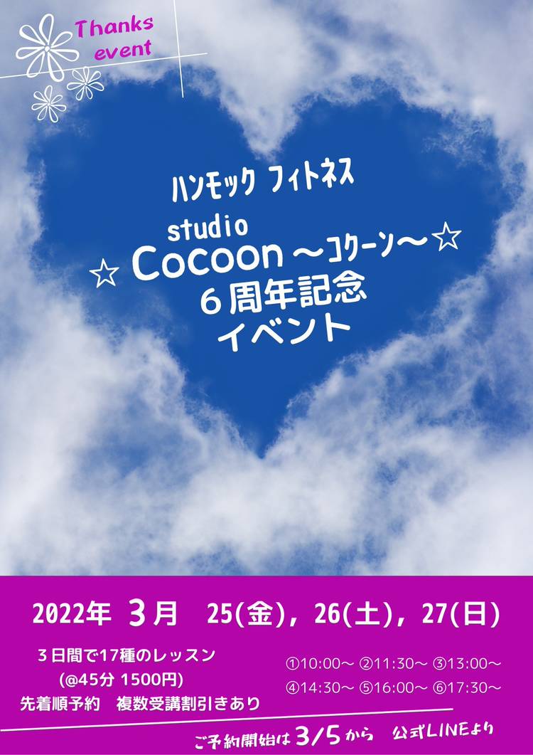 こんにちは! いよいよ 今月末〜 3/28(木)〜30(土) ☆8周年記念☆ イベントレッスン開催 ですょ! メンバー様はお得に🩷 初めての方は気軽に💕 お久しぶりの方も💞 ☆studio Cocoon☆で ハンモック体験して頂けます。 もちろん、ヨガ クラスも どなた様でも受講ok ! ご予約は既に 始まっております。 満席に近いクラスもござい ますので、お早目に ご...