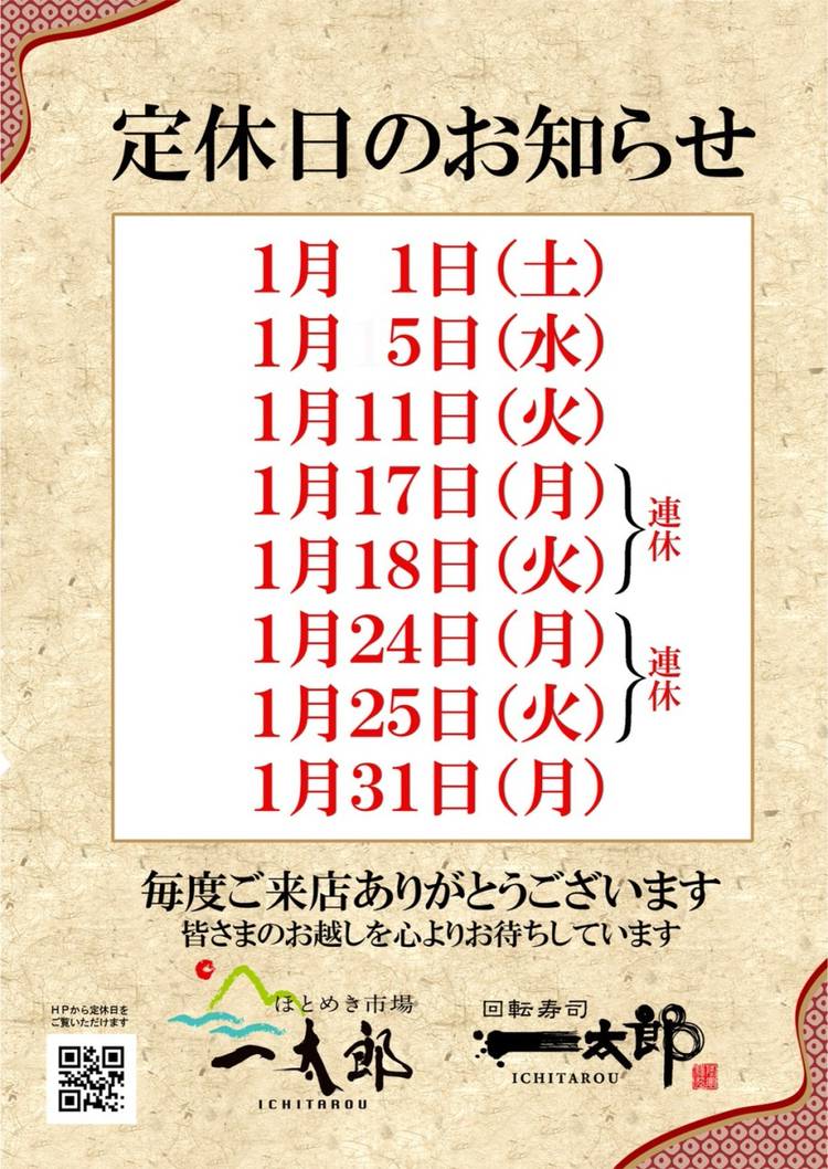 安全で安心なおいしい毎日の食卓をプロデュースする一太郎グループの公式LINE@アカウントです。 【ほとめき市場一太郎】 鮮度・味・品質にこだわり、お値打ち価格でご提供する食のテーマパーク。 【回転寿司一太郎】 鮮魚店ならではのイケスがあるからこそ新鮮な食材を楽しめる本格志向の回転寿司。 【魚一太郎直方店】 屋台のようなお祭り気分を味わえる市場 【めん太郎】 一太郎グループ初の麺屋。麺のこだわりだけでなく野菜や素材にこだわったビビンバやスタミナ丼なども! 【Lunchroom ICHITARO】 1番人気のこだわりソフトクリームや、トアルコトラジャの本格ドリップコーヒーが楽しめるカフェ。