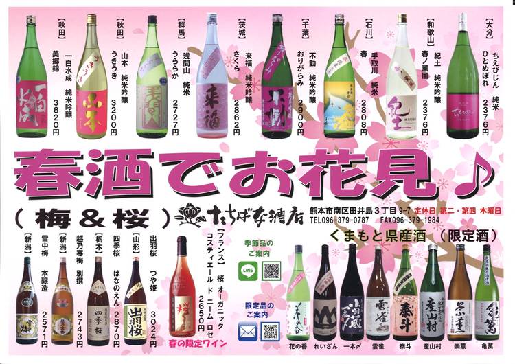 春酒のお知らせ! 色鮮やかなピンクラベルの春酒♪各蔵元様より続々入荷中です。 花見は日本の文化長い冬からようやく温かい春を迎えます。 春らしく華やかな香りとかわいらしいピンク色のラベル、飲みやすい低アルコールの物や、桜の花びらが舞うような「おりがらみ」などございます。 桜の木の下で美味しいお酒をお楽しみください。