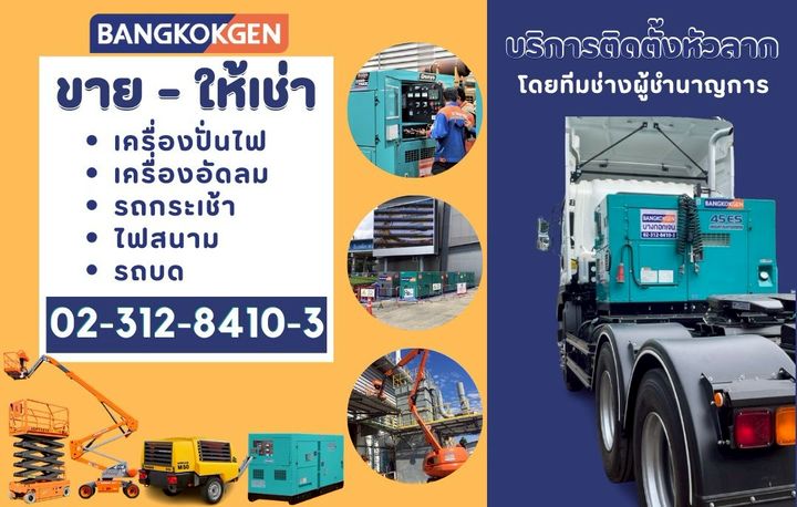 "เราคือผู้นำด้านเครื่องจักรก่อสร้าง" เราจำหน่ายและให้บริการเช่า เครื่องกำเนิดไฟฟ้า เครื่องอัดลม เครื่องเชื่อม รถกระเช้า ไฟสนาม ตู้สำนักงานสนาม และเครื่องจักรกลหนักอื่นๆ นอกจากนี้เราคือตัวแทนจำหน่ายแต่งตั้งอย่างเป็นทางการของ Denyo เครื่องกำเนิดไฟฟ้าอันดับหนึ่งจากญี่ปุ่น เครื่องอัดลม Airman ซึ่งยอดขายถล่มทลายในประเทศไทย ไฟสนาม Allmand ซึ่งมีความทนทางมาก รถกระเช้า Dingli ยอดขายอันดับหนึ่งในประเทศจีน