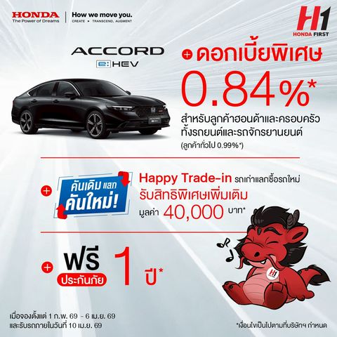 ราคา เริ่มต้น 1,499,000.- The Accord Turbo เลือกเส้นทางแห่งผู้นำที่คุณเชื่อ ฮอนด้า แอคคอร์ด 1.5 ลิตร Di VTEC TURBO ขุมพลัง 190 แรงม้า เร่งแรงดั่งใจด้วยแรงบิด 243 นิวตัน-เมตร มอบสมรรถนะการขับขี่และอัตราประหยัดน้ำมันดีเยี่ยม พร้อมดีไซน์ใหม่ ไฟตัดหมอกคู่หน้าแบบ LED สปอร์ตยิ่งขึ้นด้วย ปลอกท่อไอเสียคู่แบบสเตนเลส ล้ำสมัยด้วยเทคโนโลยีความปลอดภัยอัจฉริยะ Honda SENSING… สู่ทุกจุดหมายอย่างมั่นใจ *หมายเหตุ : สีภายในแตกต่างกัน ขึ้นอยู่กับสีภายนอก, สีขาวแพลทินัม (มุก) เพิ่ม 12,000 บาท และสีดำคริสตัล (มุก) เพิ่ม 8,000 บาทhe Accord Turbo เลือกเส้นทางแห่งผู้นำที่คุณเชื่อ ฮอนด้า แอคคอร์ด 1.5 ลิตร Di VTEC TURBO ขุมพลัง 190 แรงม้า เร่งแรงดั่งใจด้วยแรงบิด 243 นิวตัน-เมตร มอบสมรรถนะการขับขี่และอัตราประหยัดน้ำมันดีเยี่ยม พร้อมดีไซน์ใหม่ ไฟตัดหมอกคู่หน้าแบบ LED สปอร์ตยิ่งขึ้นด้วย ปลอกท่อไอเสียคู่แบบสเตนเลส ล้ำสมัยด้วยเทคโนโลยีความปลอดภัยอัจฉริยะ Honda SENSING… สู่ทุกจุดหมายอย่างมั่นใจ *หมายเหตุ : สีภายในแตกต่างกัน ขึ้นอยู่กับสีภายนอก, สีขาวแพลทินัม (มุก) เพิ่ม 12,000 บาท และสีดำคริสตัล (มุก) เพิ่ม 8,000 บาท