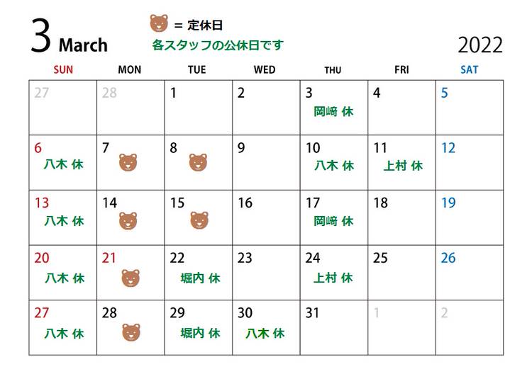 毎週月曜、第二第三火曜定休日、日曜のみ最終受付18:00