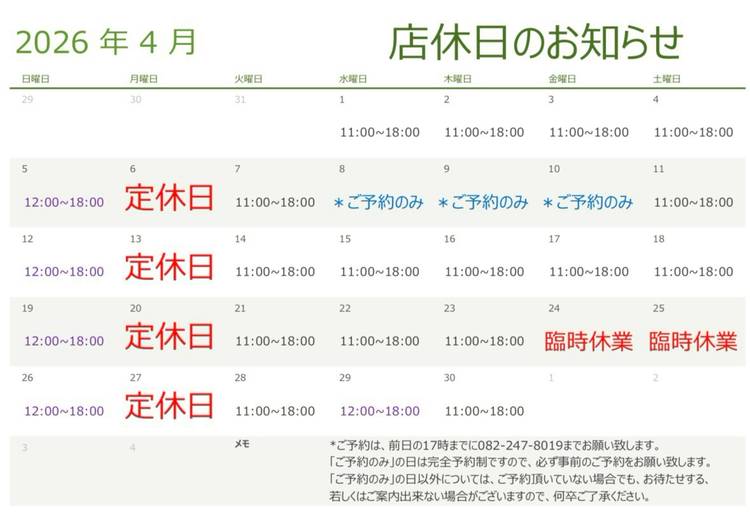 休みが変動する場合がありますので、ご了承ください。
