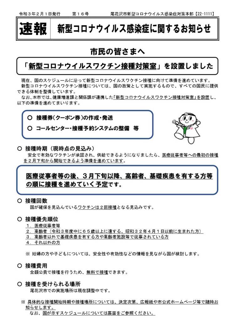 ●「新型コロナウイルスワクチン接種対策室」を設置しました。 市では、2月1日付で、新型コロナウイルスワクチン接種対策室を設置しました。現在、接種券・予約システム・会場の準備を進めています。 当面のおおまかなスケジュール等は以下の通りです。国の指示により変更となることがあります。 ※2月3日現在の予定です。 ・3月中旬以降 高齢者へ接種券(クーポン券)郵送 ↓ ・4月以降 高齢者へのワ...
