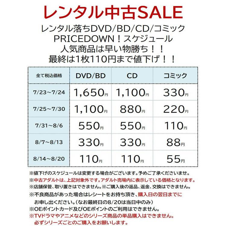 【レンタル・販売CD/DVD営業終了のおしらせ】 いつもご利用いただきありがとうございます。 WAY書店TSUTAYA美浜店はこの度、レンタル・販売CD/DVDのお取扱いを終了致します。 ・販売CD・DVDのご予約、お取り寄せの受付は終了致しました。 ・レンタルCD・DVDを1週間レンタルして頂ける終了日は7月14日(月)です。 ・レンタル最終貸出日は7月21日(月)です。 今後の予定は決ま...