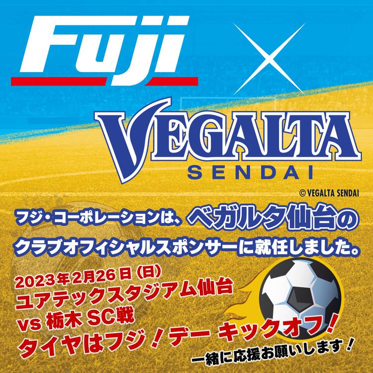 フジ・コーポレーションはベガルタ仙台のクラブオフィシャルスポンサーに就任しました 2023年2月26日(日)ユアテックスタジアム仙台にてタイヤはフジ!デーと題し、ホーム開幕戦が行われます 宮城に本社を構える企業として、サポーターの皆様と一緒に応援し、ともに東北を盛り上げます! 皆様も応援宜しくお願いいたします