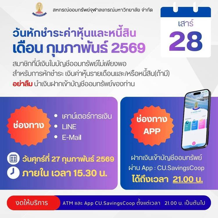 บริการสมาชิกทางด้านการฝาก-ถอนเงินฝากออมทรัพย์ ซื้อหุ้น กู้ยืมเงิน และสวัสดิการต่างๆ เพือสมาชิกสหกรณ์ออมทรัพย์จุฬาลงกรณ์มหาวิทยาลัย จำกัด
