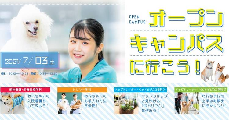 河原アイペットのオープンキャンパス 次回は、3月19日(土)開催 新高校3年生は「AO入試」エントリー資格もゲットできる! かわいい動物たちと楽しい先輩たちと一緒に、動物のお仕事を体験しよう♪ 体験授業のメニューはこちら ①ドッグトレーナー・ペットビジネス学科:しつけの基本動作にチャレンジ! ②動物看護・栄養管理学科:わんちゃんのおやつを作ろう! ③トリマー学科:...