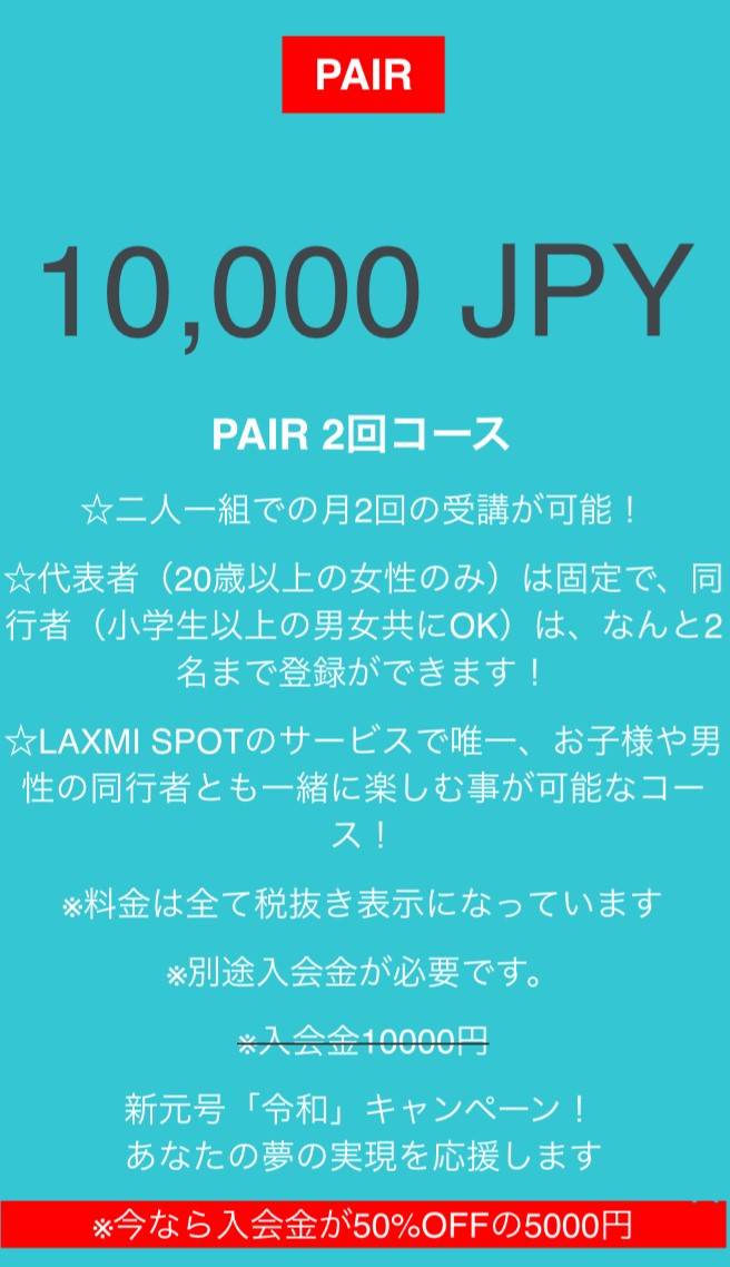 【 本日7月1日、Laxmi Spotに新コースが登場しました】 今までお客様の声として多々あったご意見を参考に、 本日7月1日から新たに誕生したコースのご紹介です 「Pair 2回コース」の登場です 【特徴】 2人1組でのペア受講が、月2回できるコース。2人1組の価格で¥10,000(税別)です。 他のコース同様、クール毎(1カ月毎)に、コースの...